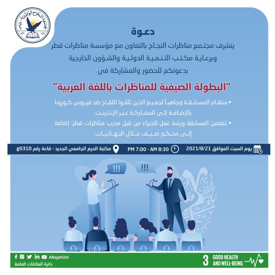 يدعوكم مجتمع مناظرات النجاح، برعاية مكتب التنمية الدولية والشؤون الخارجية، لحضور "البطولة الصيفية للمناظرات باللغة العربية"، وذلك يوم السبت 21 أغسطس.