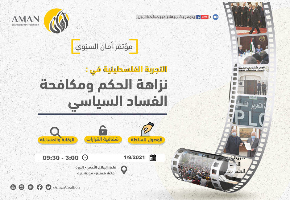"التجربة الفلسطينية في نزاهة الحكم ومكافحة الفساد السياسي"يتشرف الائتلاف من أجل النزاهة والمساءلة (أمان)، بدعوتكم للمشاركة في مؤتمره السنوي للعام 2021، الذي يُعقد في ظل استمرار وتعاظم التحديات أمام نزاهة الحكم، والتي كان أبرزها تآكل احترام مبدأ الفصل بين السلطات، وضعف الرقابة المتبادلة بين السلطات الثلاثة التشريعية والتنفيذية والقضائية، حيث تعززت هيمنة السلطة التنفيذية على أعمال السلطتين التشريعية والقضائية في الضفة والقطاع، الأمر الذي أثّر سلباً على نزاهة الحكم وأضعف من ثقة المواطنين، وأعاق جهود مكافحة الفساد وأبقى السلطة التنفيذية دون رقابة ومساءلة حقيقية في مجالات الإدارة العامة وإدارة المال العام.