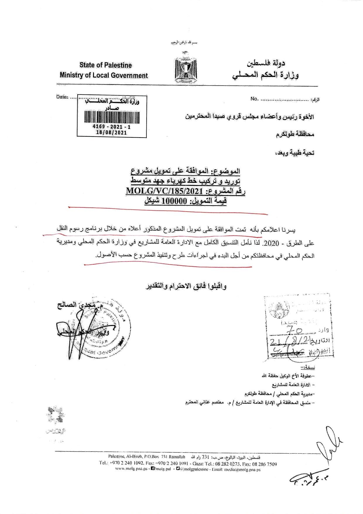 "تم حصولنا على تمويل مشروع شراء محول الكهرباء، وسيتم المباشرة بالمشروع في الأيام المقبلة وأيضا حصولنا على تمويل إضافي لتكملة مبنى البلدية وسط البلدة بقيمة (100.000) شيقل".