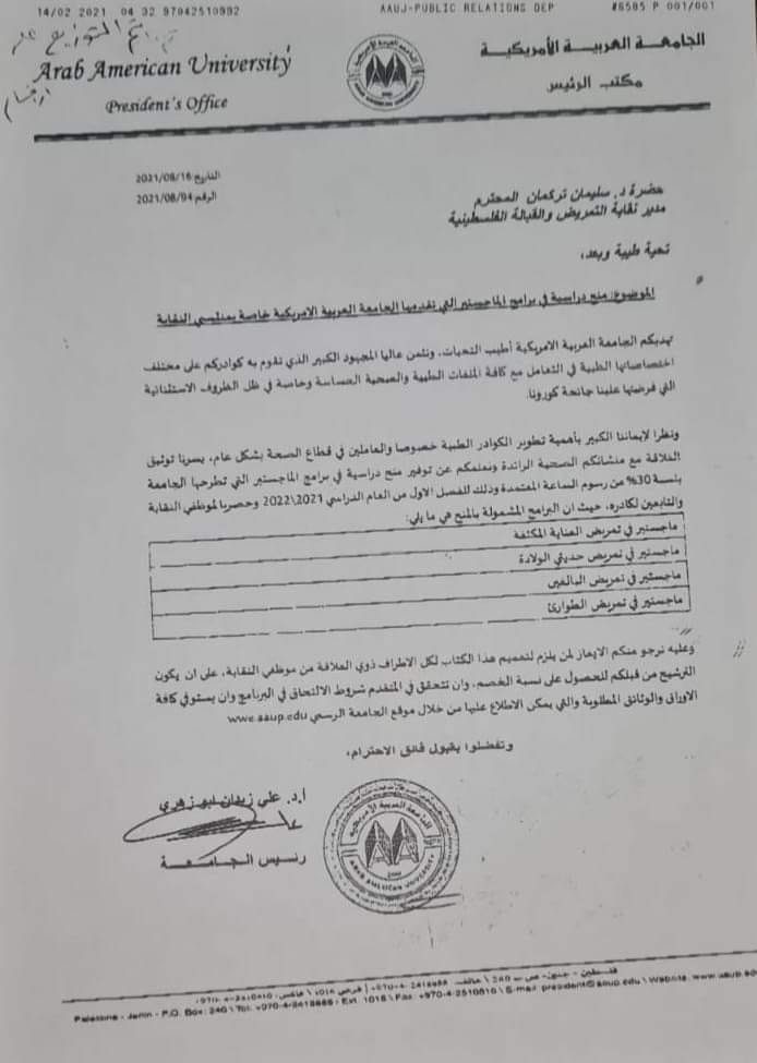 الجامعة العربية الأمريكية تعلن عن منح دراسية لمنتسبي نقابة التمريض والقبالة الفلسطينية.