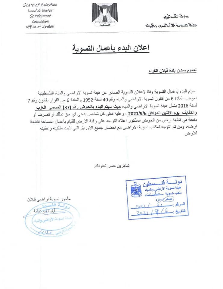 بلدية قبلان تعلن عن بدء أعمال التسوية في حوض رقم 37، المسمى العزب والكفايف.