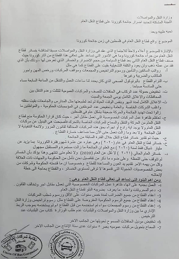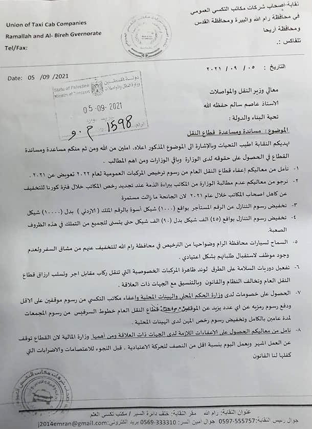 نقابة مكاتب التكسي العمومي تطالب وزارة النقل بإعفاء قطاع النقل العام من رسوم ترخيص المركبات العمومية لعام 2022، بالإضافة لتسهيلات أخرى من أجل مساندة قطاع النقل.