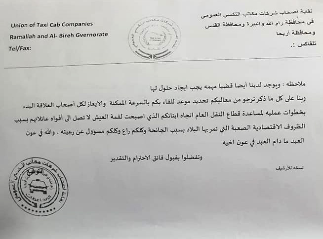 المصدر: نقابة أصحاب مكاتب التكسي العمومي في رام الله والبيرة والقدس وأريحا