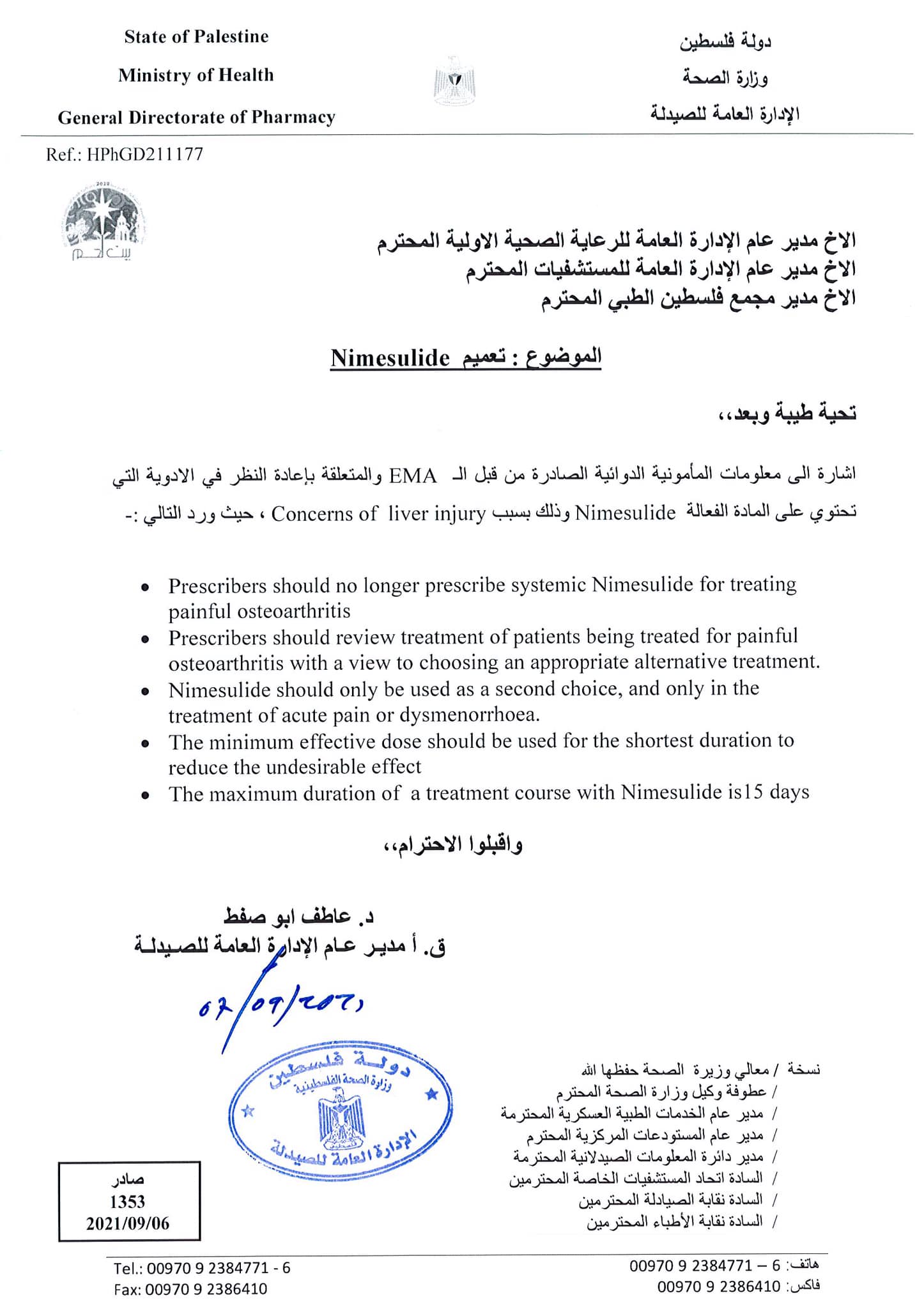 الإدارة العامة للرعاية الصحية تصدر تعميماً بخصوص الأدوية التي تحتوي على المادة الفعالة Nimesulide.