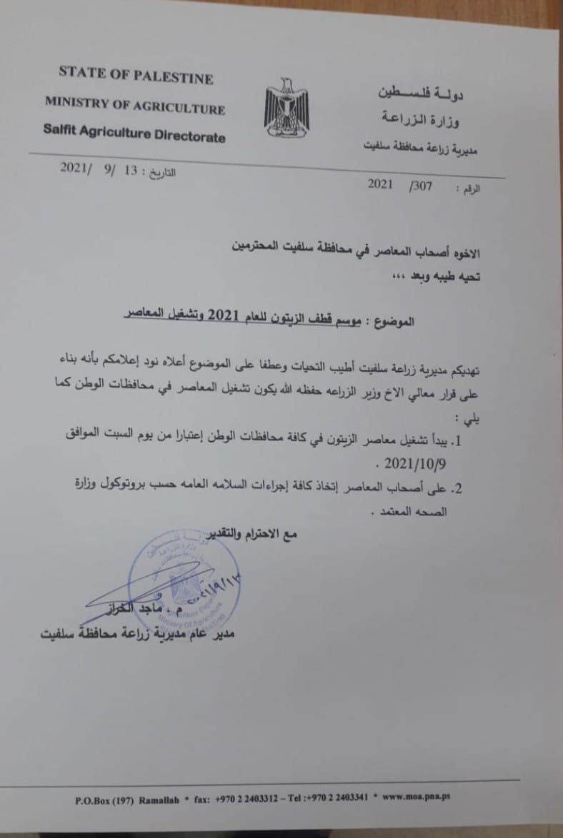 نشرت مديرية زراعة سلفيت، الاثنين 13.09.2021، موعد تشغيل معاصر الزيتون في كافة محافظات الوطن، حسب قرار وزير الزراعة الفلسطينية، وذلك السبت 19.09.2021.