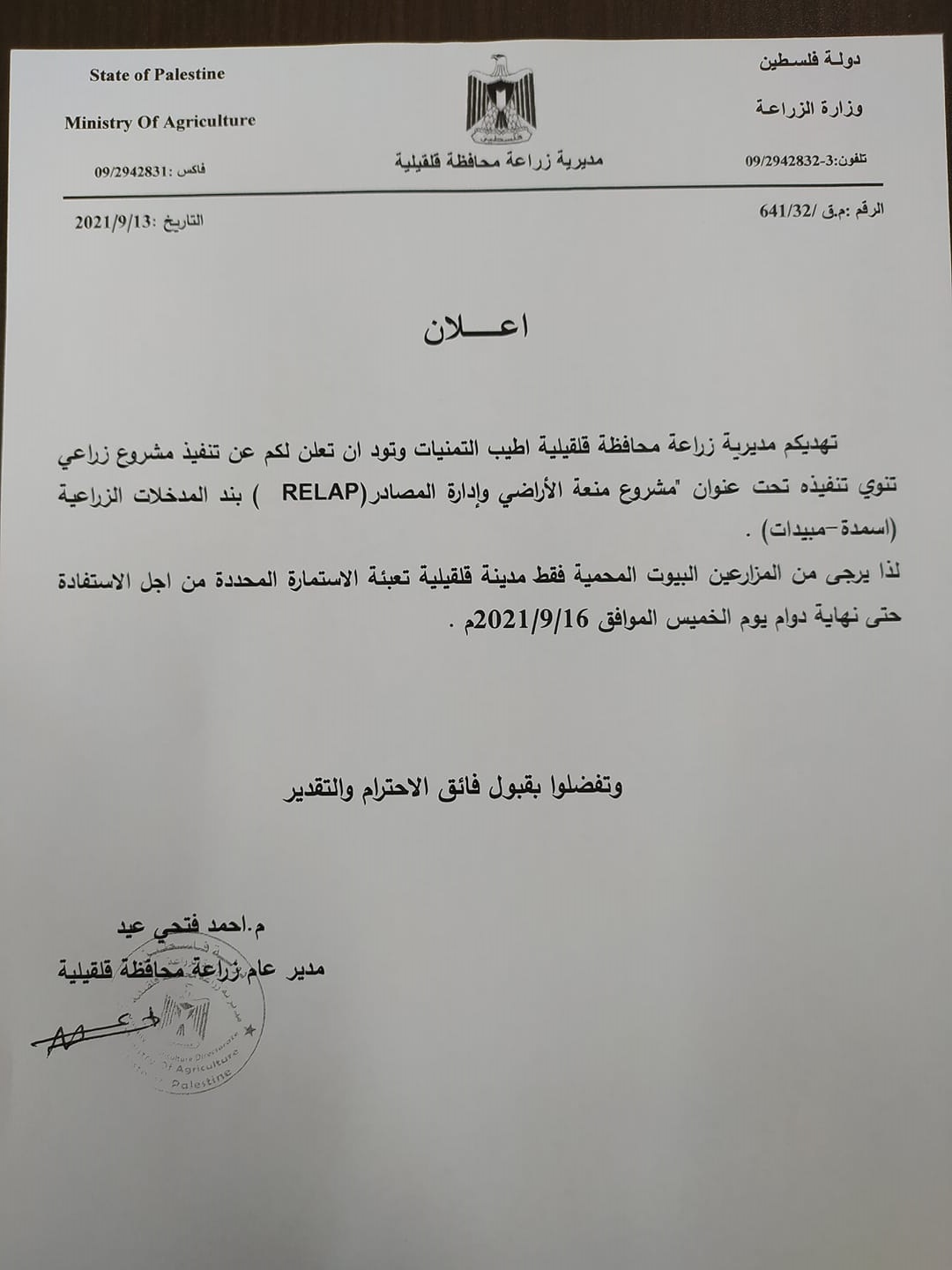 مديرية زراعة قلقيلية تعلن عن تنفيذ مشروع زراعي على بند المدخلات الزراعية (أسمدة - مبيدات).