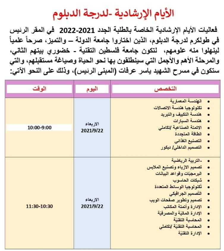 جدول فعاليات الأيام الإرشادية للطلبة الجدد - درجة الدبلوم في جامعة خضوري.