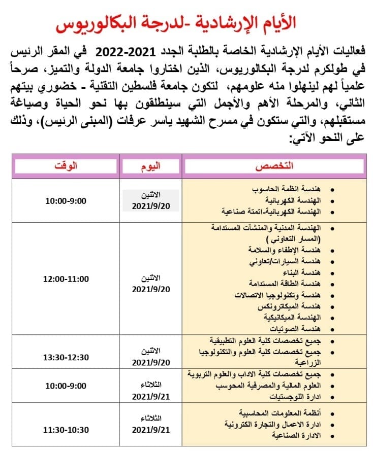 جدول فعاليات الأيام الإرشادية للطلبة الجدد لدرجة البكالوريوس في جامعة خضوري.