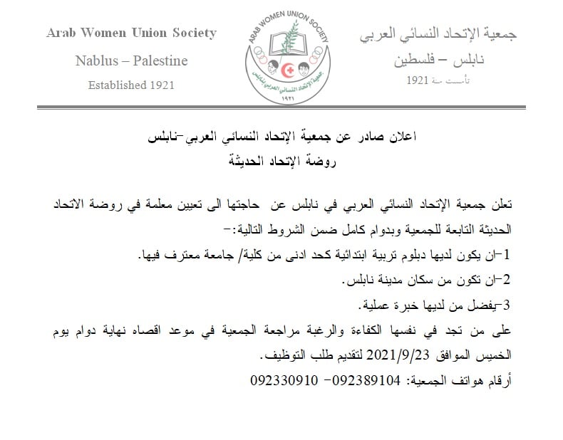 أعلنت جمعية الاتحاد النسائي العربي في نابلس، الأحد 19.09.2021، عن حاجتها إلى تعيين معلمة ابتدائية، ويفضل أن تكون من مدينة نابلس.