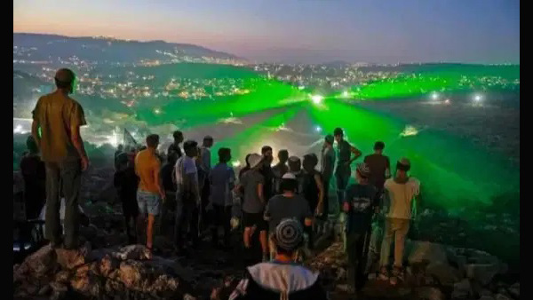 يتظاهر أهالي بيتا شمال الضفة الغربية المحتلة على طريقتهم مستخدمين أضواء ليزر باللون الأخضر ومطلقين ضجيجا صاخبا لإزعاج المستوطنين الذين أقاموا مستوطنة على أرض تقول الحكومة الإسرائيلية إنها تبحث في ملف ملكيتها.