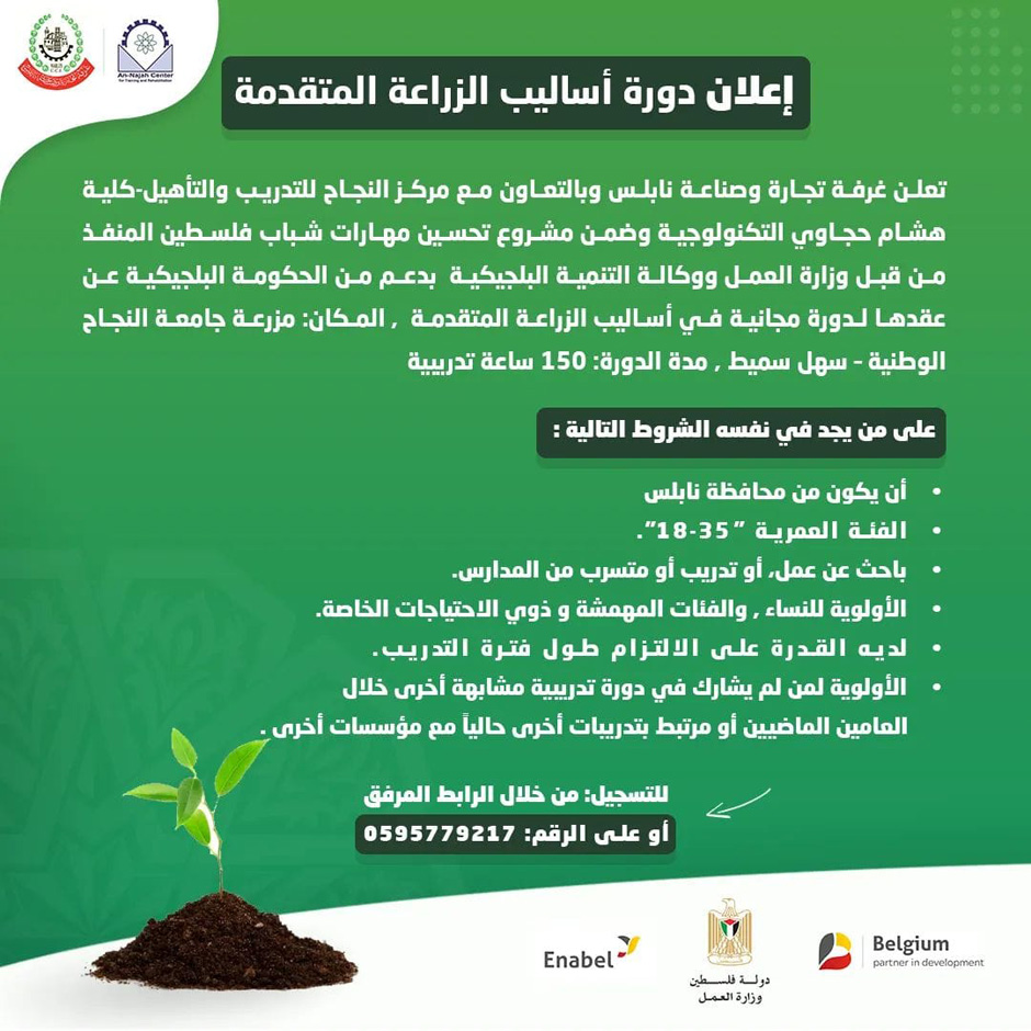 أعلنت غرفة تجارة وصناعة نابلس، الثلاثاء 28.09.2021، وبالتعاون مع مركز النجاح للتدريب والتأهيل - كلية هشام حجاوي التكنولوجية وذلك ضمن مشروع تمكين مهارات شباب فلسطين بالشراكة وبدعم من وكالة التنمية البلجيكية عن عقد دورة في أساليب الزراعة الحديثة.