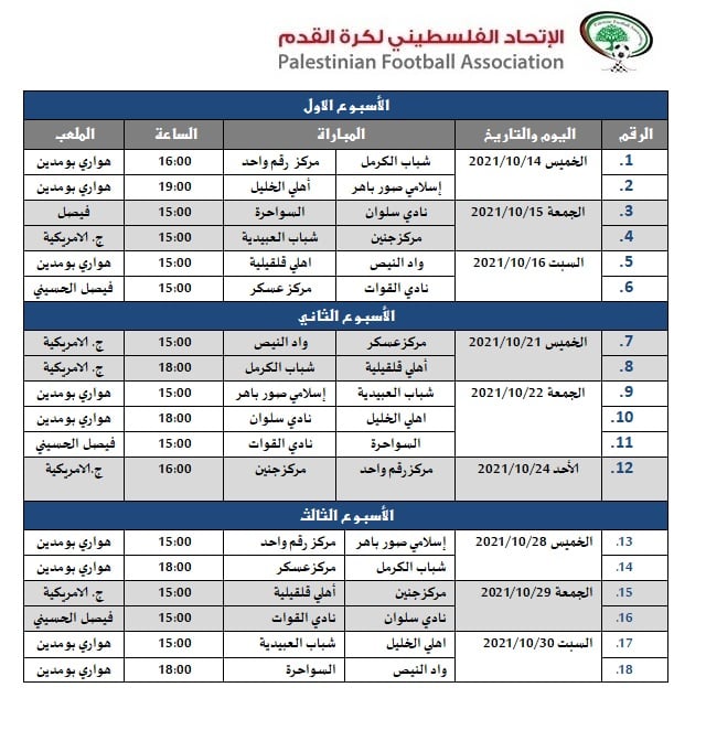 أعلن الاتحاد الفلسطيني لكرة القدم، السبت 02.10.2021، عن جدول مباريات الأسابيع الثلاثة الأولى من دوري الاحتراف الجزئي.