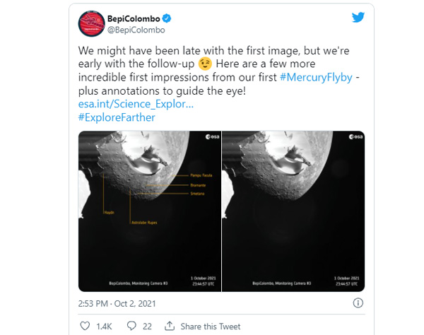 هذه المرة الأولى منذ إطلاق القمر الاصطناعي المشترك بين وكالتي الفضاء الأوروبية واليابانية "بيبي كولومبو" عام 2018 التي ترسل صور لكوكب عطارد الذي يشكّل "هدفاً" له. ومن المقرر أن يُكتفى بوضع هذا القمر الاصطناعي في مدار عطارد في العام 2025 لأن الوصول إلى أصغر كواكب النظام الشمسي بالغ الصعوبة.