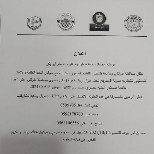 أعلنت محافظة طولكرم، الاثنين 04.10.2021، عن فتح باب التسجيل ببطولة الشطرنج تحت رعاية محافظ طولكرم عصام أبو بكر، بالشراكة مع مجلس اتحاد الطلبة في جامعة خضوري والاتحاد الفلسطيني للشطرنج.