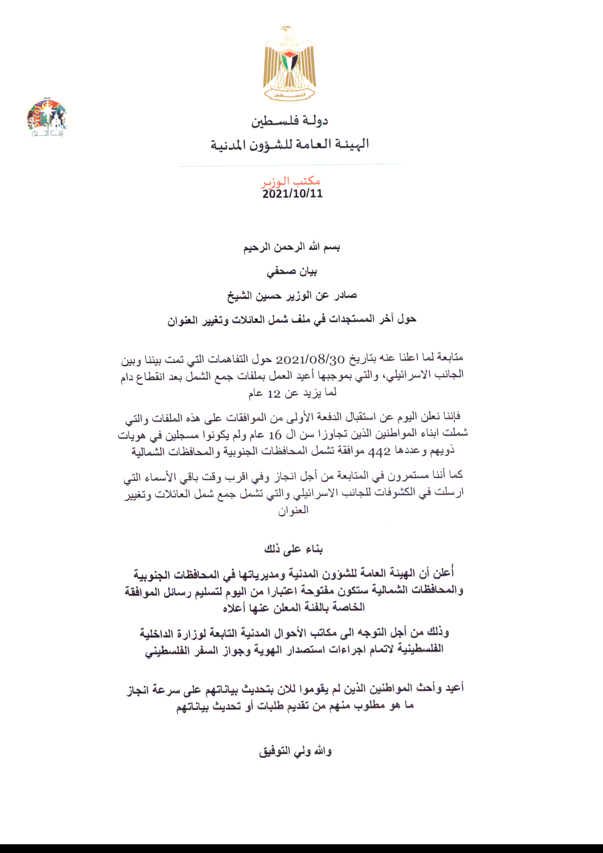 بيان صادر عن الهيئة العامة للشؤون المدنية بخصوص آخر المستجدات في ملف لم الشمل وتغيير العنوان.