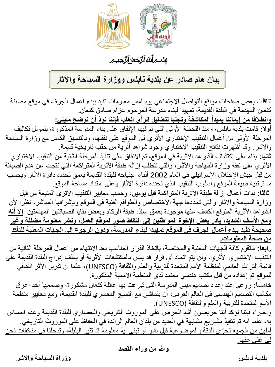 بلدية نابلس ووزارة السياحة والآثار تنشران بياناً حول أعمال الحفر في موقع مصبنة كنعان المهدمة، وتقولان إن ما يجري هو أعمال التنقيب الاختباري، وإزالة الأتربة المتراكمة حسب معايير التنقيب الأثري المتبعة من وزارة السياحة والآثار.