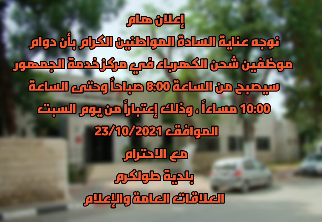 الإعلان عن تغيير أوقات دوام مركز خدمة الجمهور في بلدية طولكرم.