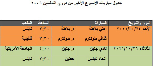 الاتحاد الفلسطيني لكرة القدم ينشر جدول مباريات الأسبوع الأخير من دوري الناشئين 2006.