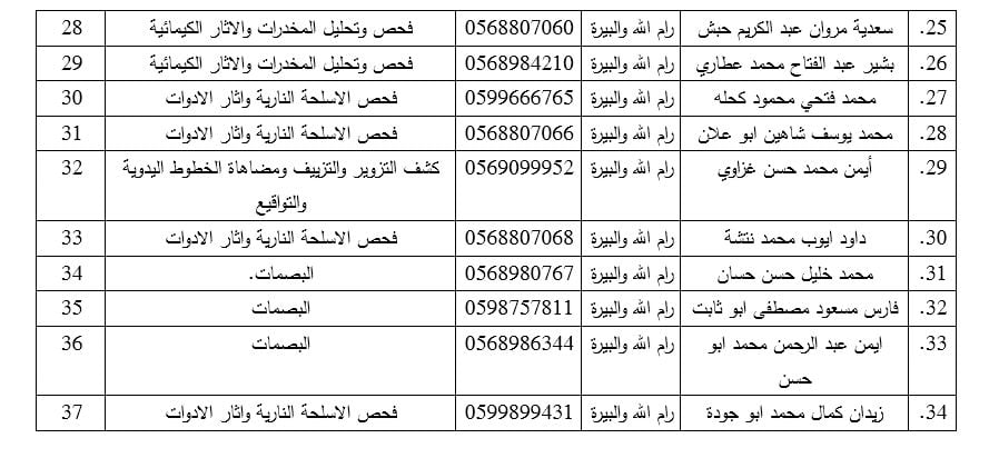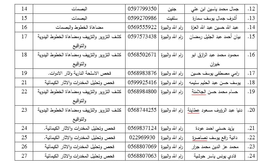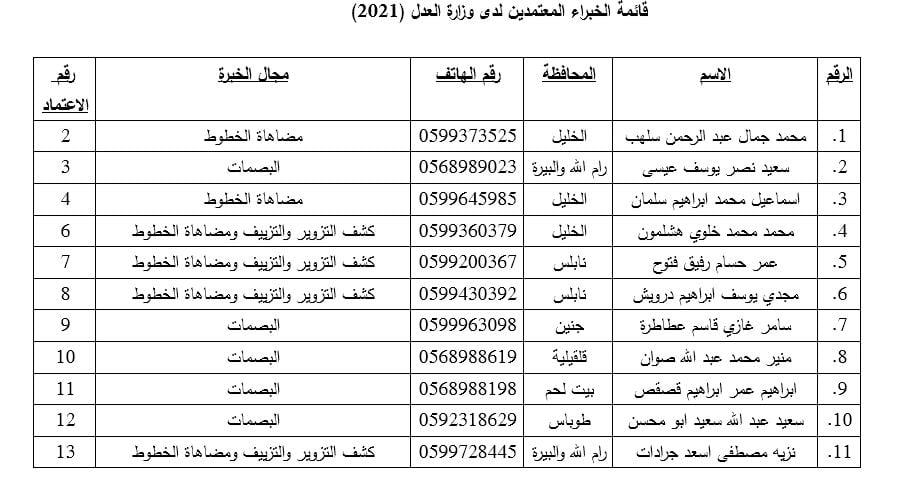 قائمة بأسماء الخبراء المعتمدين لدى وزارة العدل في مجال مضاهاة الخطوط وكشف التزوير والبصمات وفحص وتحليل المخدرات والآثار الكيميائية.
