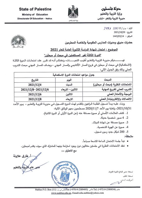 أعلنت وزارة التربية والتعليم، الأحد 24.10.2021، عن موعد الدورة الثالثة من الإكمال لغير المستكملين بمبحث أو مبحثين في امتحان الثانوية العامة.