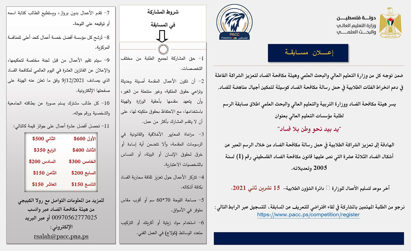 تعلن وزارة التعليم العالي والبحث العلمي بالشراكة مع هيئة مكافحة الفساد عن إطلاق مسابقة الرسم لطلبة مؤسسات التعليم العالي بعنوان "يد بيد نحو وطن بلا فساد"، على الطلبة الراغبين بالمشاركة تسليم الأعمال في موعد أقصاه، الخميس 11.11.2021، في مكتب شؤون الطلبة في الحرمين القديم والجديد، كلية هشام حجاوي التكنولوجية، كلية الزراعة والطب البيطري.