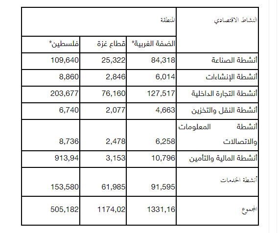 قال الجهاز المركزي للإحصاء الفلسطيني، إن عدد العاملين في المؤسسات الاقتصادية العاملة في القطاع الخاص والأهلي في فلسطين ضمن الانشطة الاقتصادية، بلغ 505,182 عاملاً، منهم 331,161 في الضفة و174,021 في غزة، بانخفاض نسبته 8.1% مقارنة بالعام 2019.
