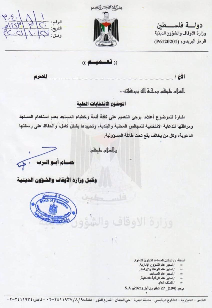 وزارة الأوقاف والشؤون الدينية تعمم على الأئمة بعدم استخدام المساجد ومرافقها للدعاية الانتخابية للمجالس المحلية والبلديات.