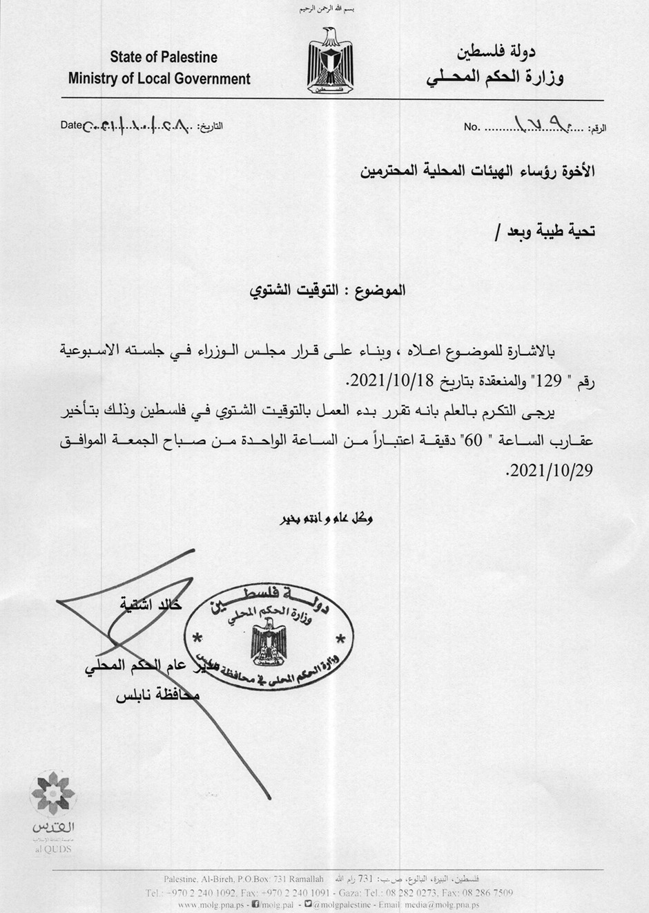 مديرية الحكم المحلي بنابلس: بدء التوقيت الشتوي