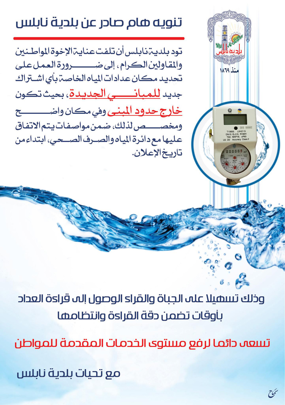 نشرت بلدية نابلس، الأحد 31.10.2021، تنويهاً هاماً للمواطنين حول ضرورة العمل على تحديد مكان عدادات المياه الخاصة لأي اشتراك جديد للمباني الجديدة.