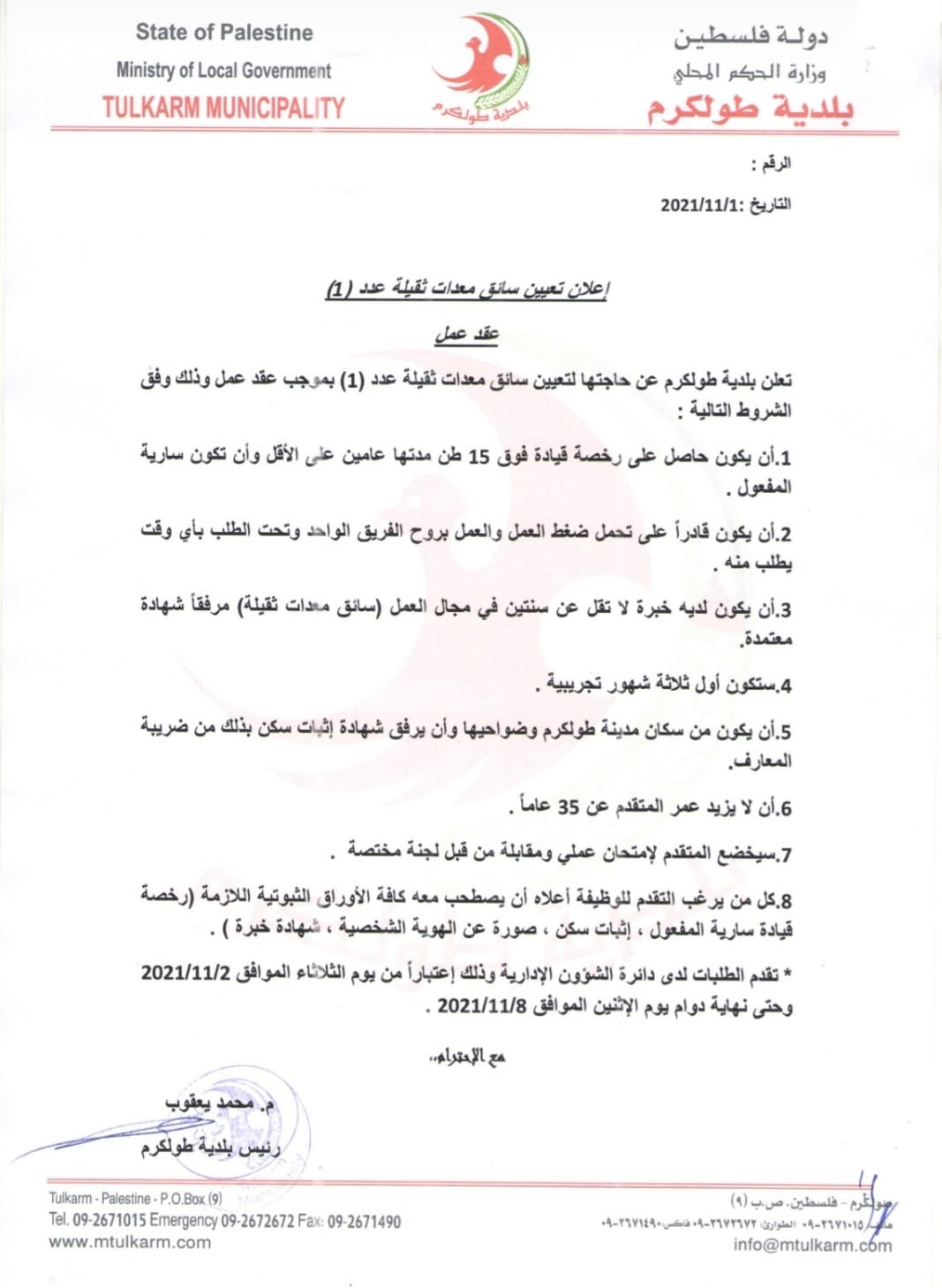 بلدية طولكرم: مطلوب سائق معدات ثقيلة