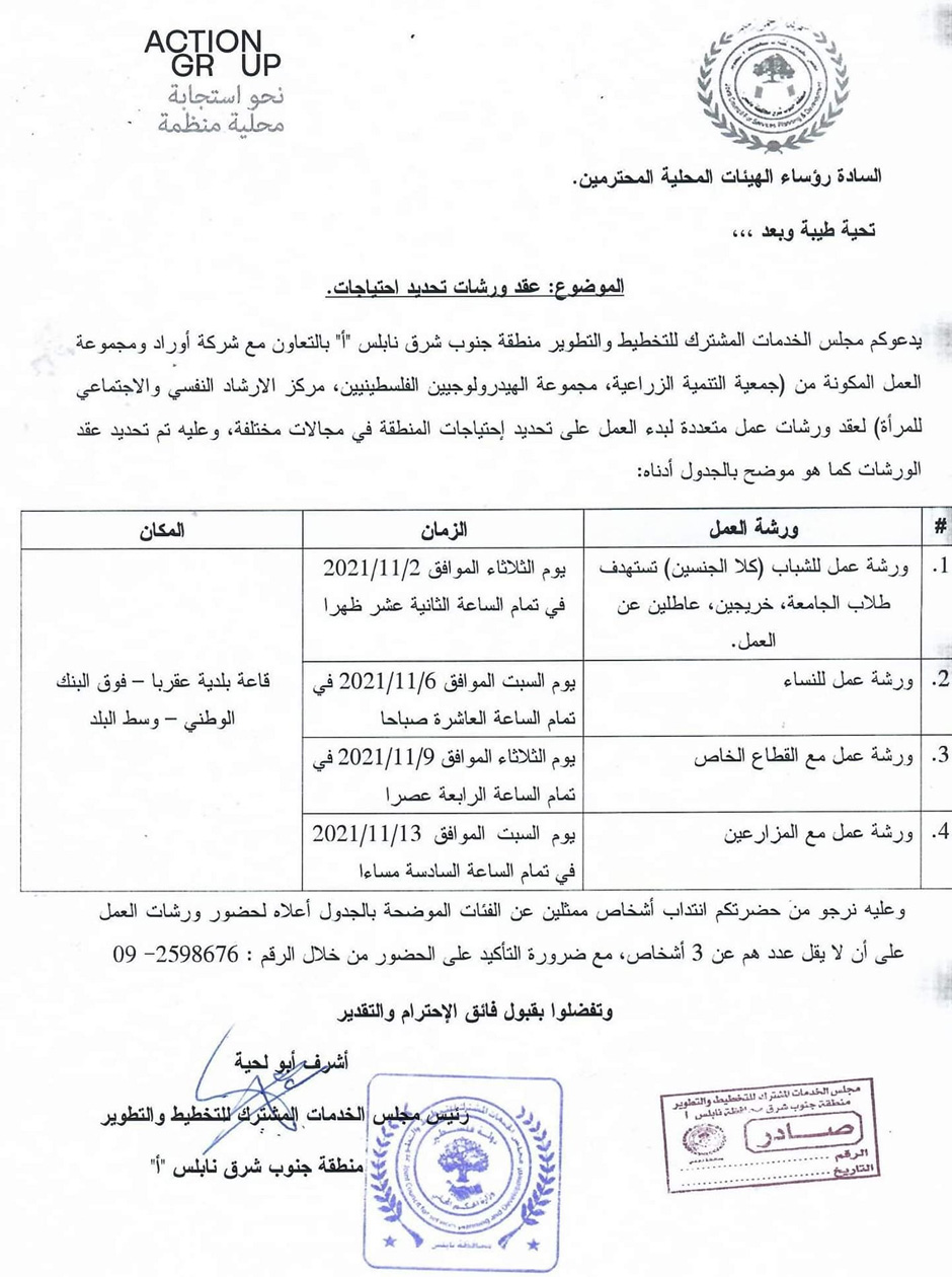 مجلس خدمات جنوب شرق نابلس يدعو لحضور ورشات لمختلف القطاعات لتحديد احتياجات القرى التابعة للمجلس.