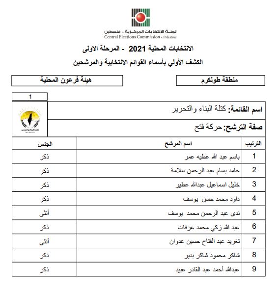 الكشف الأولي بأسماء المرشحين للانتخابات المحلية في المرحلة الأولى.