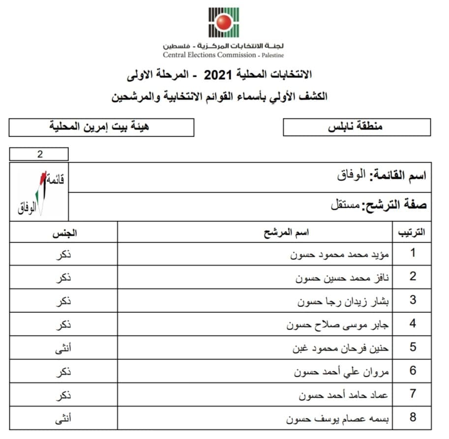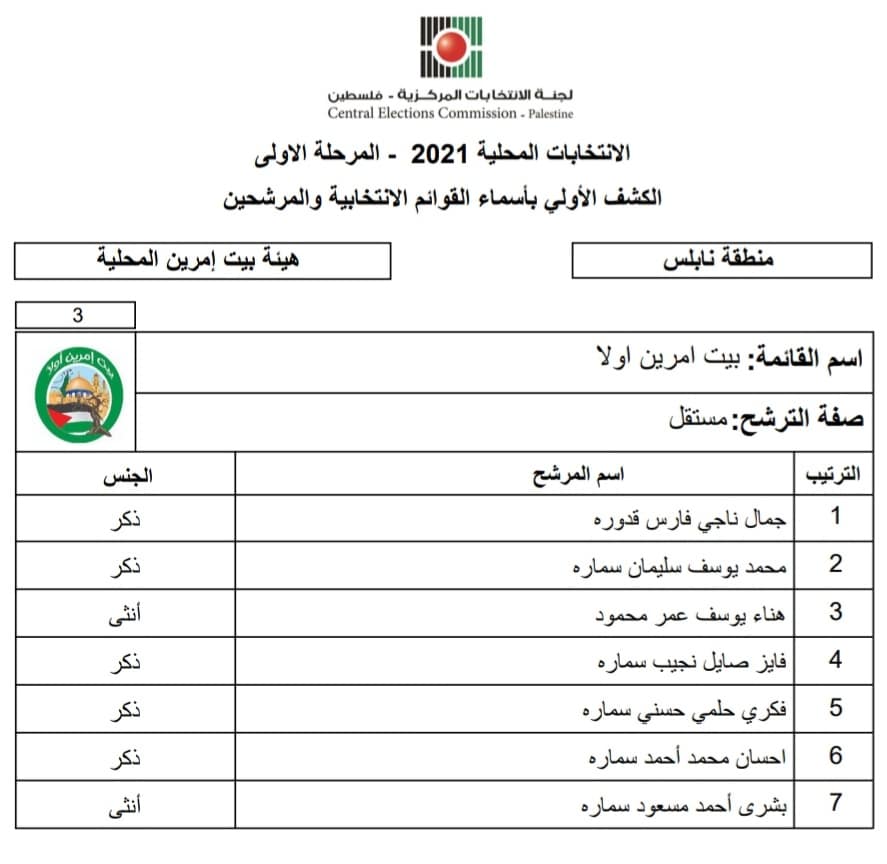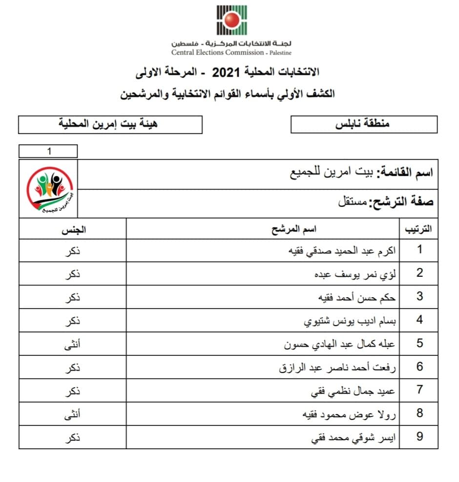 الكشف الأولي بأسماء القوائم الانتخابية والمرشحين للانتخابات المحلية 2021 - المرحلة الأولى لهيئة بيت إمرين منطقة نابلس.
