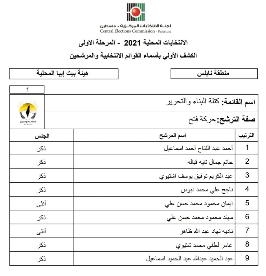 الكشف الأولي بأسماء القوائم الانتخابية والمرشحين للانتخابات المحلية 2021 - المرحلة الأولى لهيئة بيت إيبا منطقة نابلس.