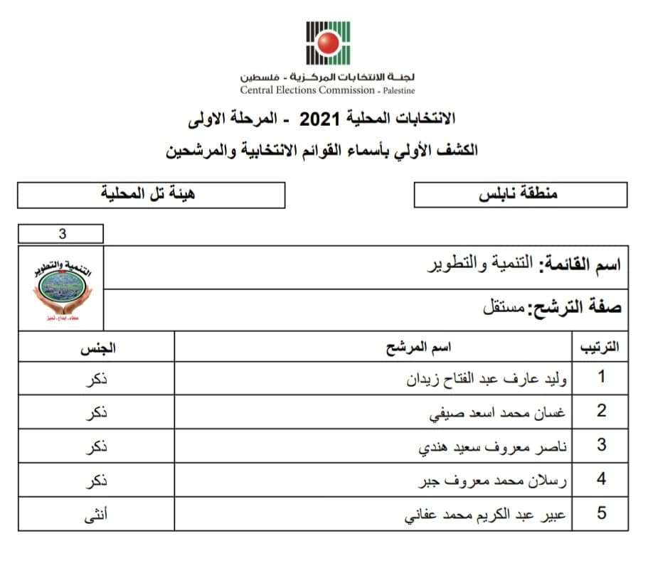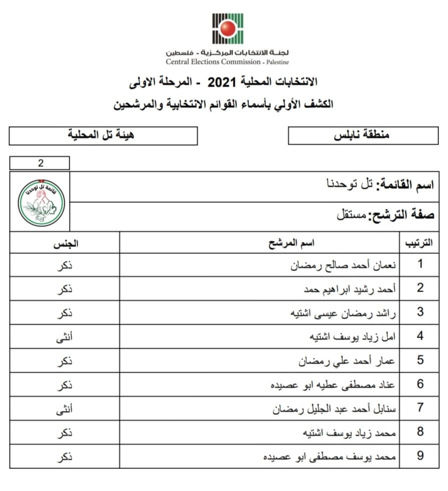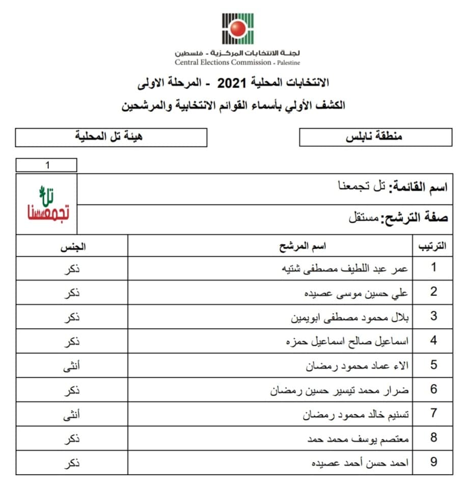 الكشف الأولي بأسماء القوائم الانتخابية والمرشحين للانتخابات المحلية 2021 - المرحلة الأولى لهيئة تل منطقة نابلس.