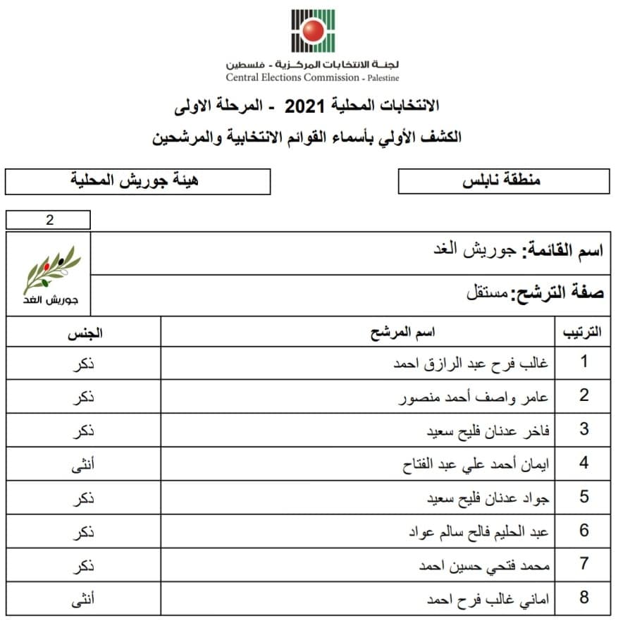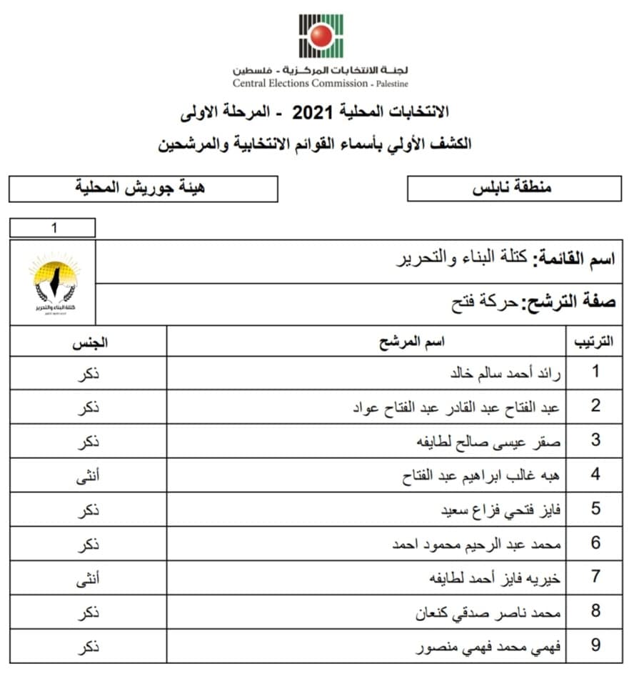 الكشف الأولي بأسماء القوائم الانتخابية والمرشحين للانتخابات المحلية 2021 - المرحلة الأولى لهيئة جوريش منطقة نابلس.