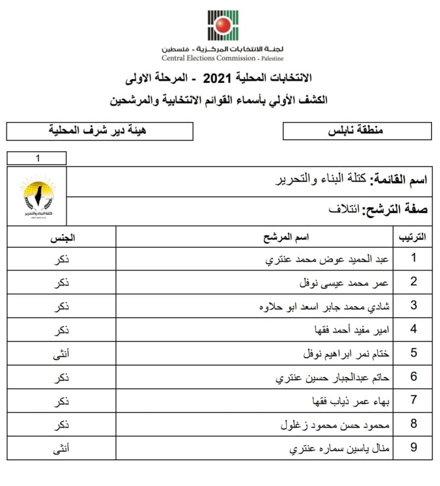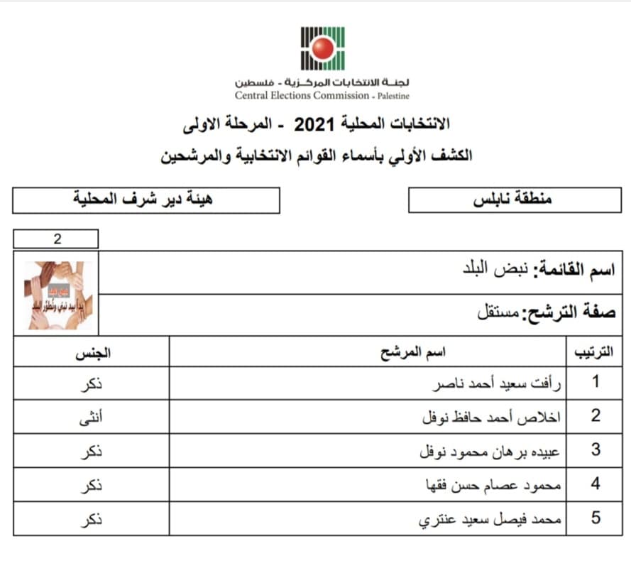 الكشف الأولي بأسماء القوائم الانتخابية والمرشحين للانتخابات المحلية 2021 - المرحلة الأولى لهيئة دير شرف منطقة نابلس.