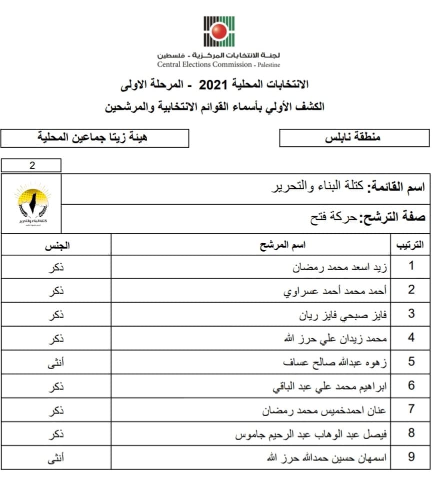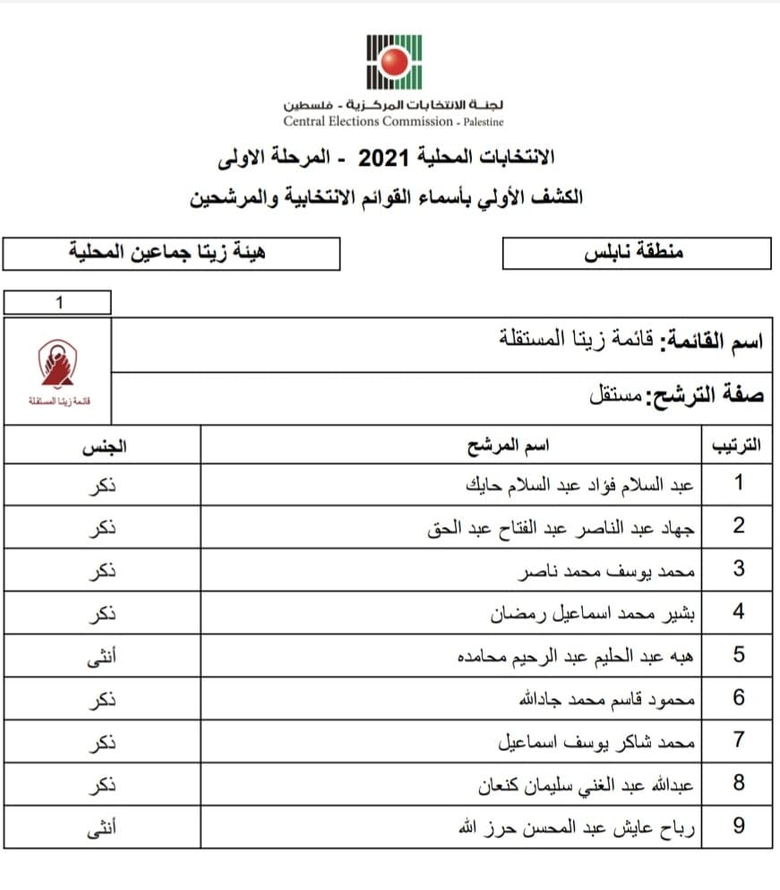 الكشف الأولي بأسماء القوائم الانتخابية والمرشحين للانتخابات المحلية 2021 - المرحلة الأولى لهيئة زيتا جماعين منطقة نابلس.