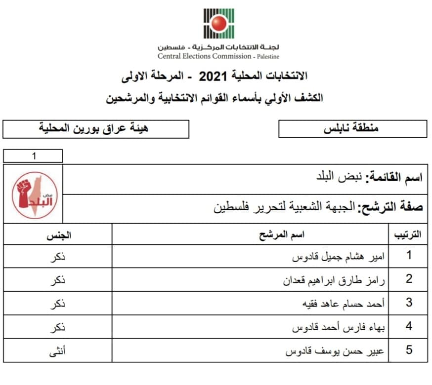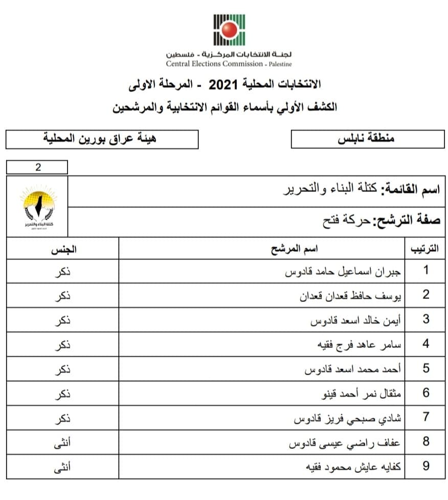الكشف الأولي بأسماء القوائم الانتخابية والمرشحين للانتخابات المحلية 2021 - المرحلة الأولى لهيئة عراق بورين منطقة نابلس.