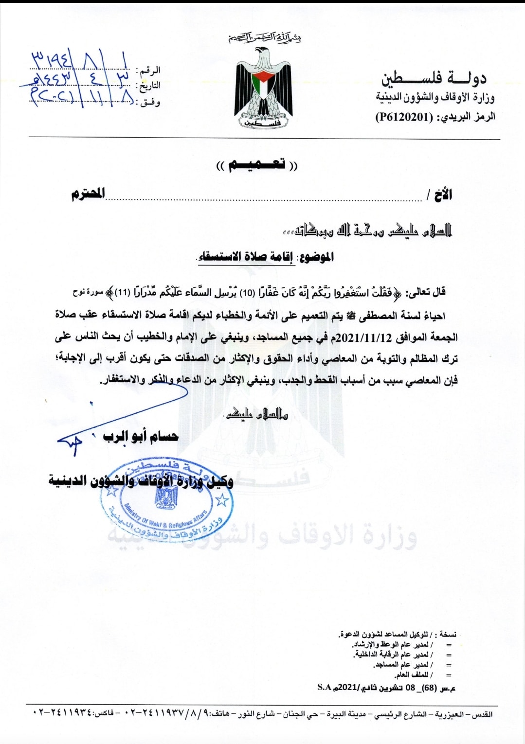 تعميم صادر عن وزارة الأوقاف بخصوص إقامة صلاة الاستسقاء.