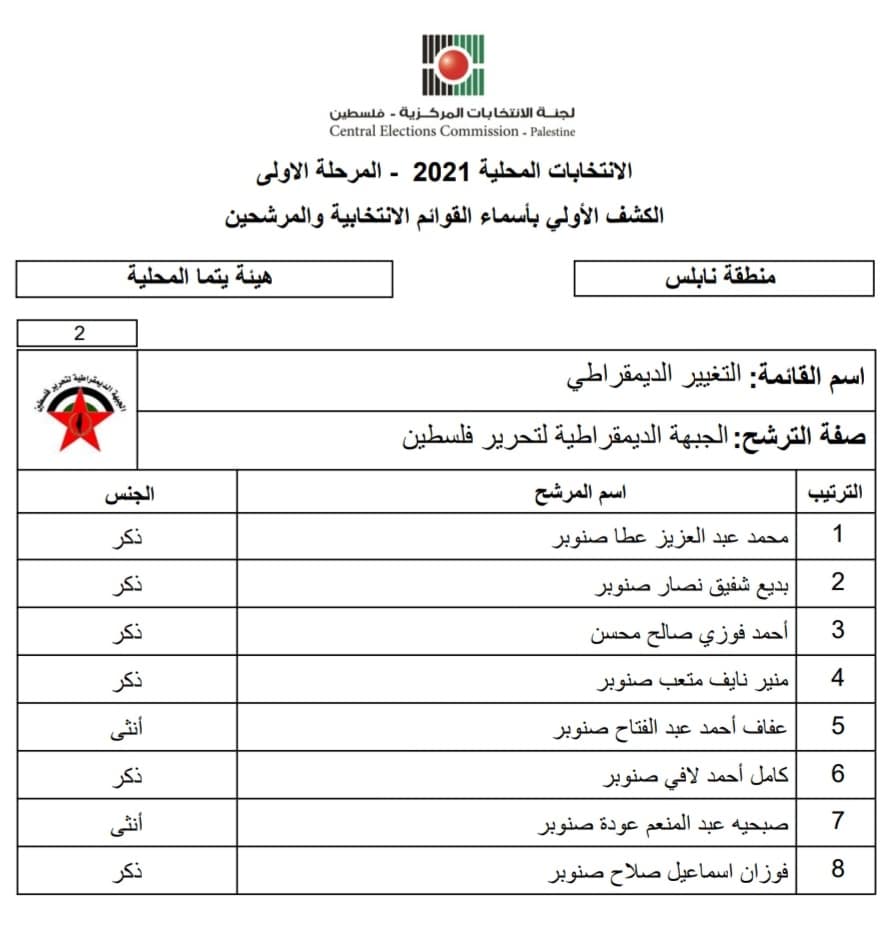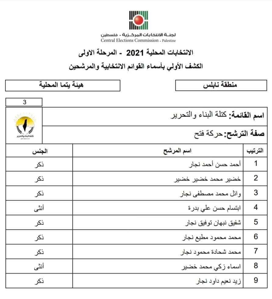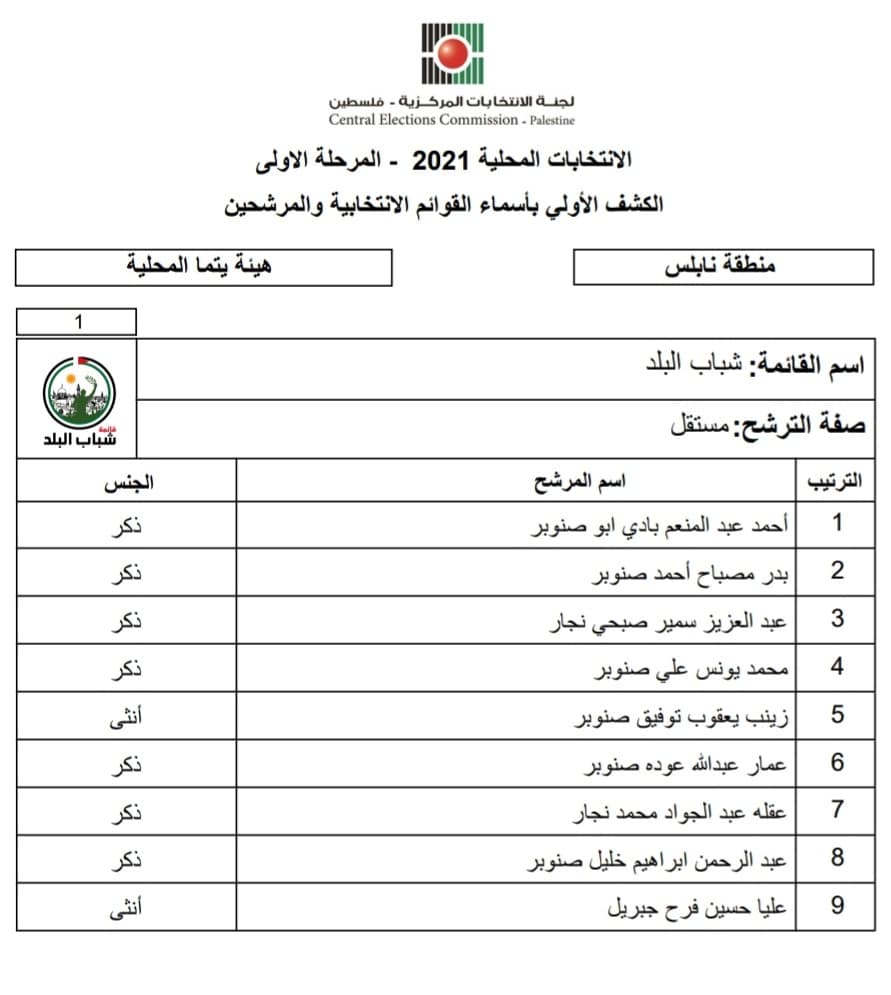 الكشف الأولي بأسماء القوائم الانتخابية والمرشحين للانتخابات المحلية 2021 - المرحلة الأولى لهيئة يتما منطقة نابلس.