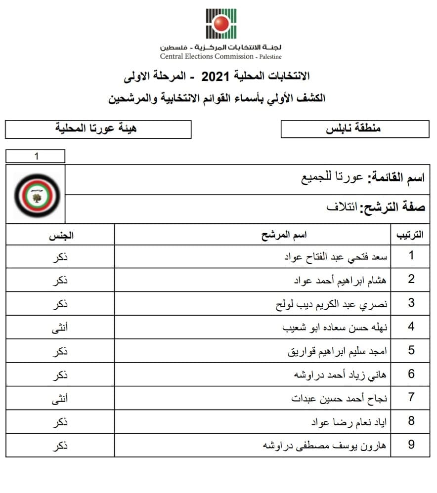 الكشف الأولي بأسماء القوائم الانتخابية والمرشحين للانتخابات المحلية 2021 - المرحلة الأولى لهيئة عورتا منطقة نابلس.