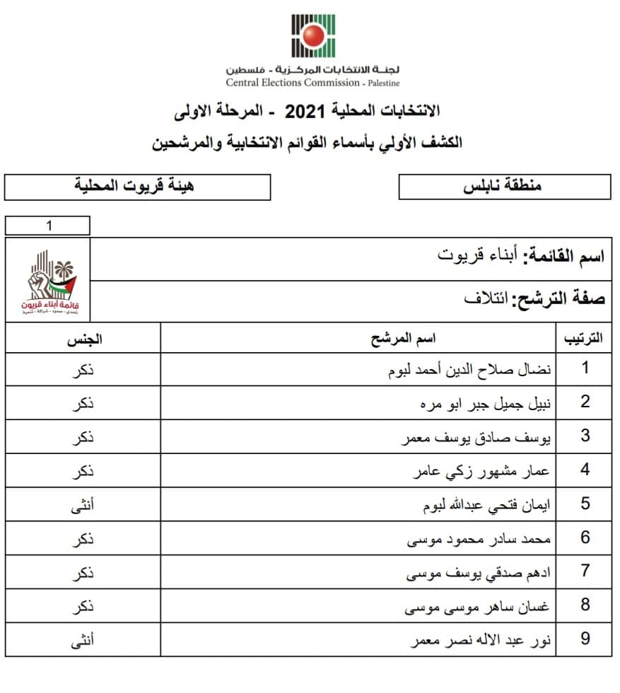 الكشف الأولي بأسماء القوائم الانتخابية والمرشحين للانتخابات المحلية 2021 - المرحلة الأولى لهيئة قريوت منطقة نابلس.