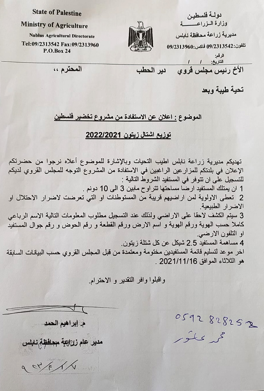 أعلن مجلس قروي دير الحطب، الأربعاء 10.11.2021، عن توفر أشتال زيتون ضمن مشروع تخضير فلسطين/ لتوزيع أشتال زيتون 2021/2022 من وزارة الزراعة.