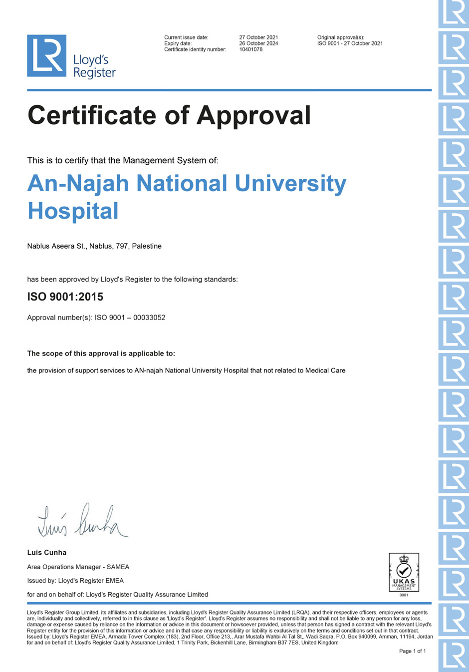 مستشفى النجاح الجامعي يحصل على شهادة الآيزو بتطوير نظام إدارة الجودة في المستشفى للعمليات التشغيلية والمساندة.