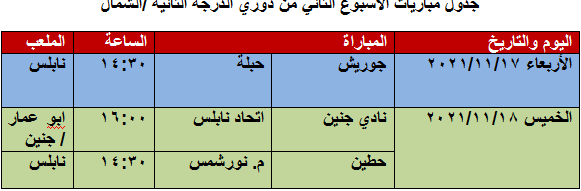 نشر الاتحاد الفلسطيني لكرة القدم فرع الشمال، الخميس 11.11.2021، جدول مباريات الأسبوع الثاني من دوري الدرجة الثانية فرع الشمال. ونتائج مباريات الأسبوع الأول من دوري الدرجة الثانية.
