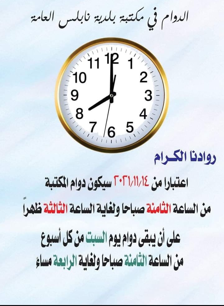 أوقات الدوام الجديدة المعدلة في مكتبة بلدية نابلس.