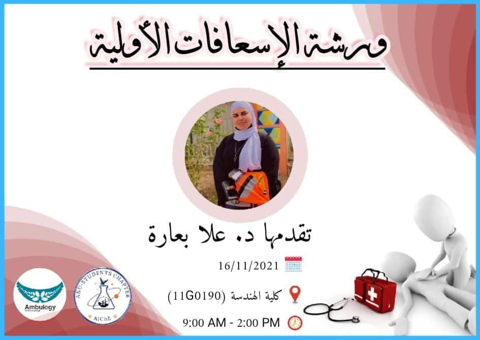 تعلن جمعية المهندسين الكيميائيين عن ورشة تدريبية عن الإسعاف الأولي بالتعاون مع مشروع امبولوجي وجمعية الإغاثة الطبية الفلسطينية.