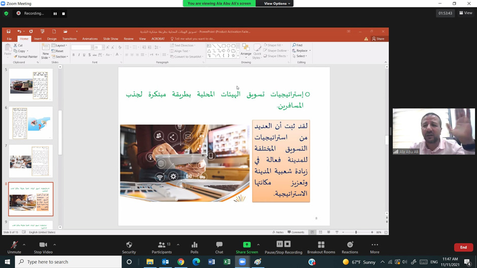 خطوات ومراحل التسويقوقدّم الاستشاري علاء أبو علي استعراضًا حول أهمية تسويق الهيئات المحلية وأبرز الخطوات والمراحل التي يتم تنفيذها من خلال إستراتيجيات التسويق التي تتيح لكل هيئة محلية الفرصة لابتكار علامة تجارية لمناطقها وربطها بتسويق الهيئة المحلية، مشيرًا إلى أهمية الاستفادة من وسائل التواصل الاجتماعي ودمجها في عملية التسويق، واستخدام وسائل غير مألوفة في الترويج وجذب الانتباه والتفكير خارج الصندوق والابتعاد عن طريقة الترويجة النمطية.