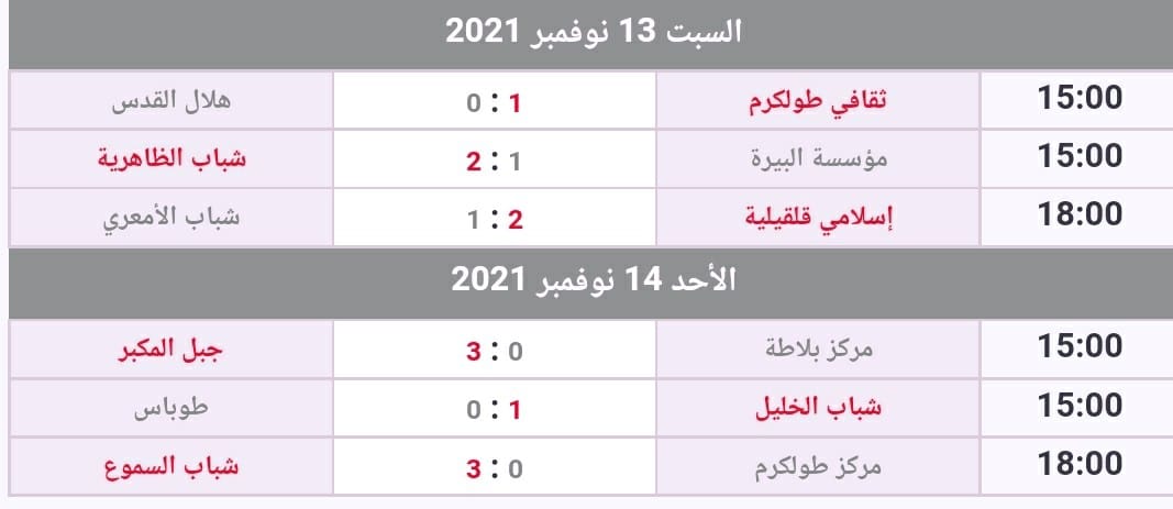 نشر نادي إسلامي قلقيلية، الأحد 14.11.2021، نتائج مباريات الجولة الثامنة من دوري المحترفين.